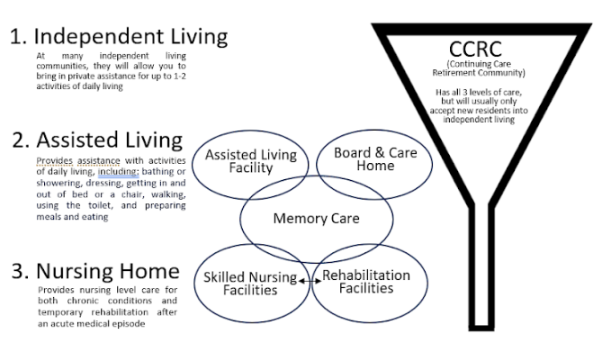 Below is a graphic showing the three levels of care, with examples of types of living communities for them, and the level of care available.