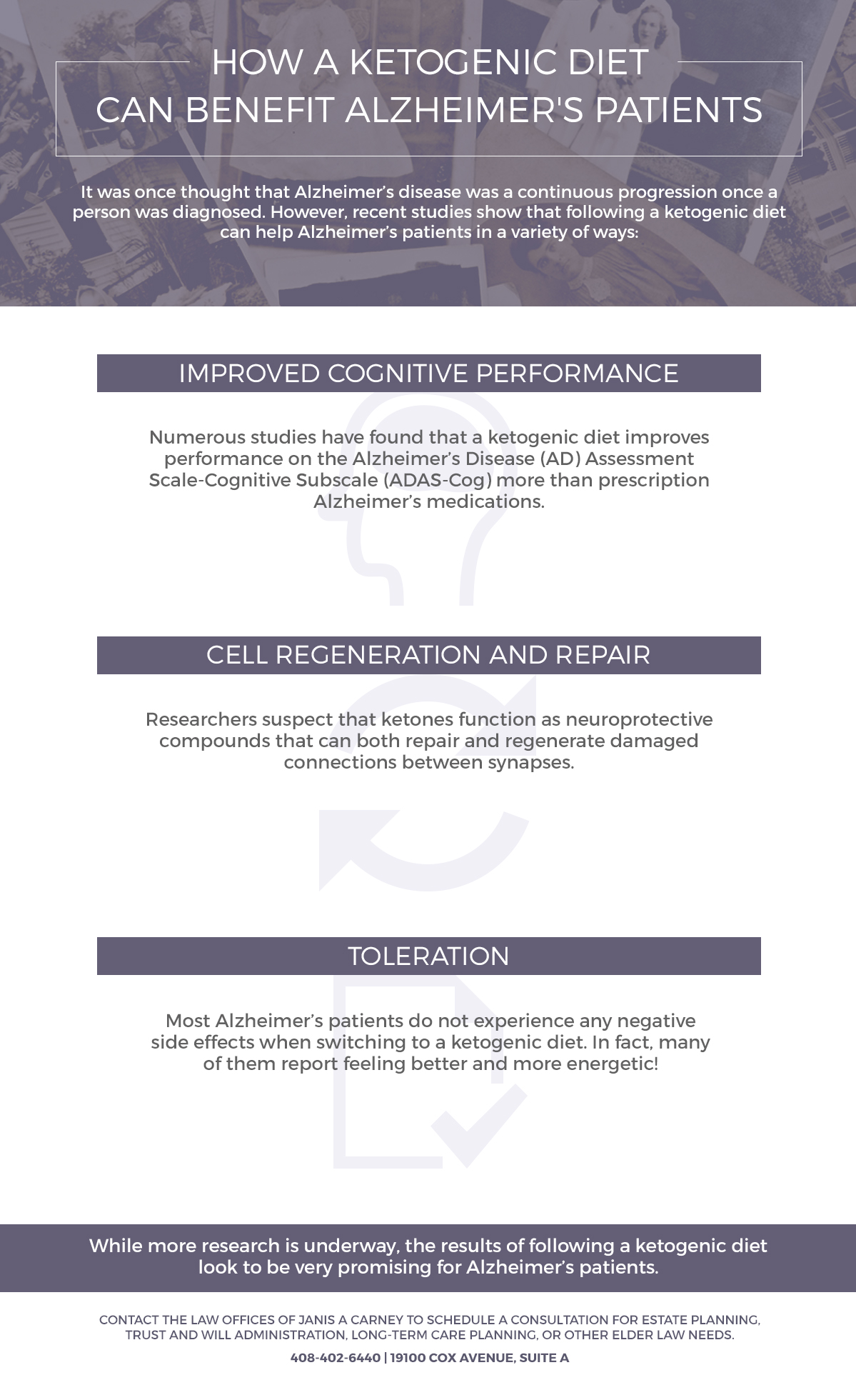 The Law Offices of Janis A Carney provides a variety of elder law services. Contact us today if you would like to speak with a Silicon Valley elder law attorney, and continue reading below to learn more about the benefits of a ketogenic diet for Alzheimer’s patients.